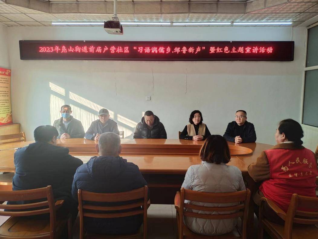 为深入学习贯彻习近平新时代中国特色社会主义思想和党的二十大精神,增强党性凝聚党心,激发辖区党员、群众的爱国热情,弘扬优秀革命传统,坚守初心使命,12月4日凫山街道前庙户营社区在社区二楼会议室开展“习语润儒乡邹鲁新声“暨红色主题宣讲活动,社区党员及工作人员12人参加。