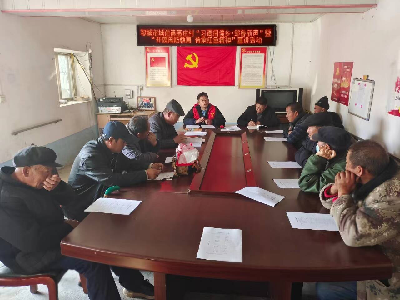 为进一步弘扬爱国主义精神,普及全民国防教育,增强村民群众的国防意识和国防观念,自觉履行国防义务,关心、支持、参与国防建设,推动全民国防教育工作走深走实,12月27日,城前镇高庄村在村新时代文明实践站开展“习语润儒乡•邹鲁新声”暨“开展国防教育 传承红色精神”宣讲活动。13名党员群众参与活动。